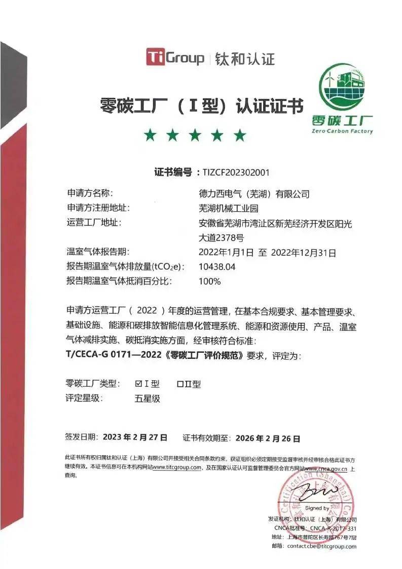 近日,德力西電氣蕪湖基地獲得由鈦和認(rèn)證頒發(fā)的零碳工廠(Ⅰ型)五星級(jí)證書,成為國(guó)內(nèi)低壓電氣行業(yè)首家零碳工廠。從建設(shè)清潔工廠開(kāi)始,至今德力西電氣先后成為了省級(jí)綠色工廠、國(guó)家級(jí)綠色工廠、碳中和工廠以及零碳工廠。德力西電氣正以“領(lǐng)航者、創(chuàng)新者、變革者”之姿,不斷樹(shù)立綠色可持續(xù)發(fā)展標(biāo)桿,為實(shí)現(xiàn)雙碳目標(biāo)貢獻(xiàn)力量。